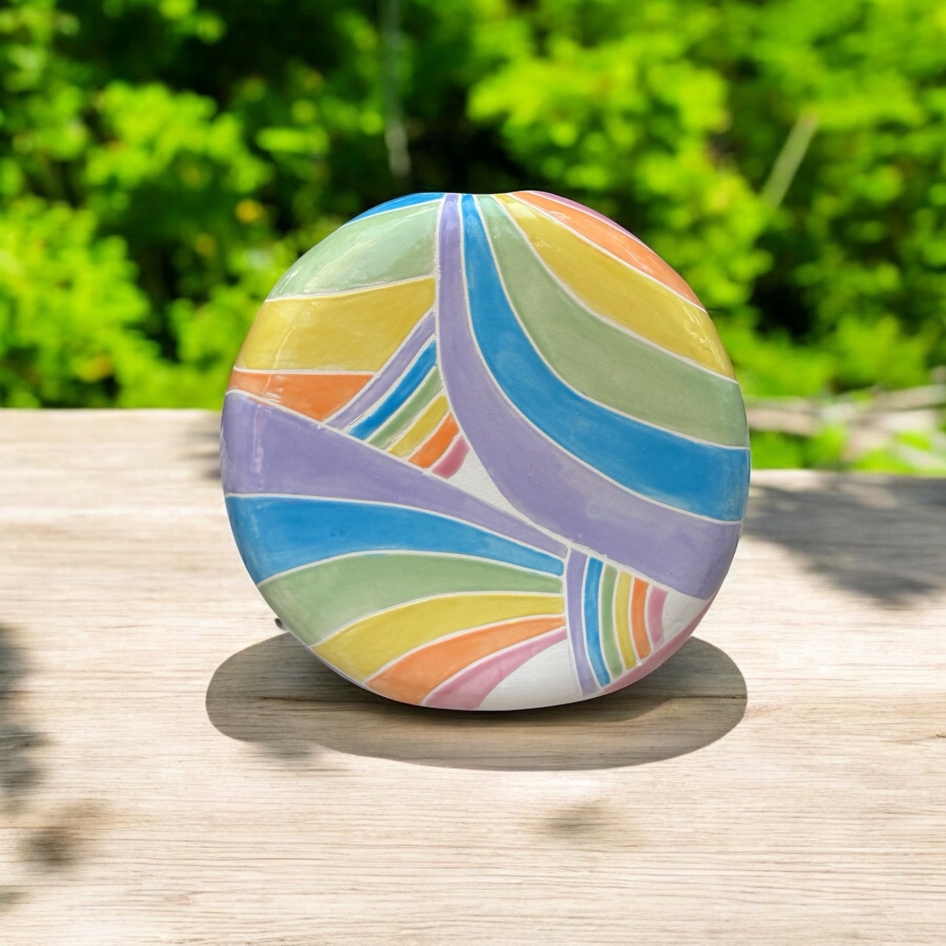 This pastel rainbow vase showcases a delicate gradient of soft rainbow hues. This vase has a smooth, gloss finish, which enhances the gentle colors, making it a perfect centerpiece for any room. The vaseÔøΩs rounded silhouette exudes a timeless charm, while its subtle palette adds a fresh, calming touch to your home decor. This vase brings a splash of understated elegance and style to everyday moments.