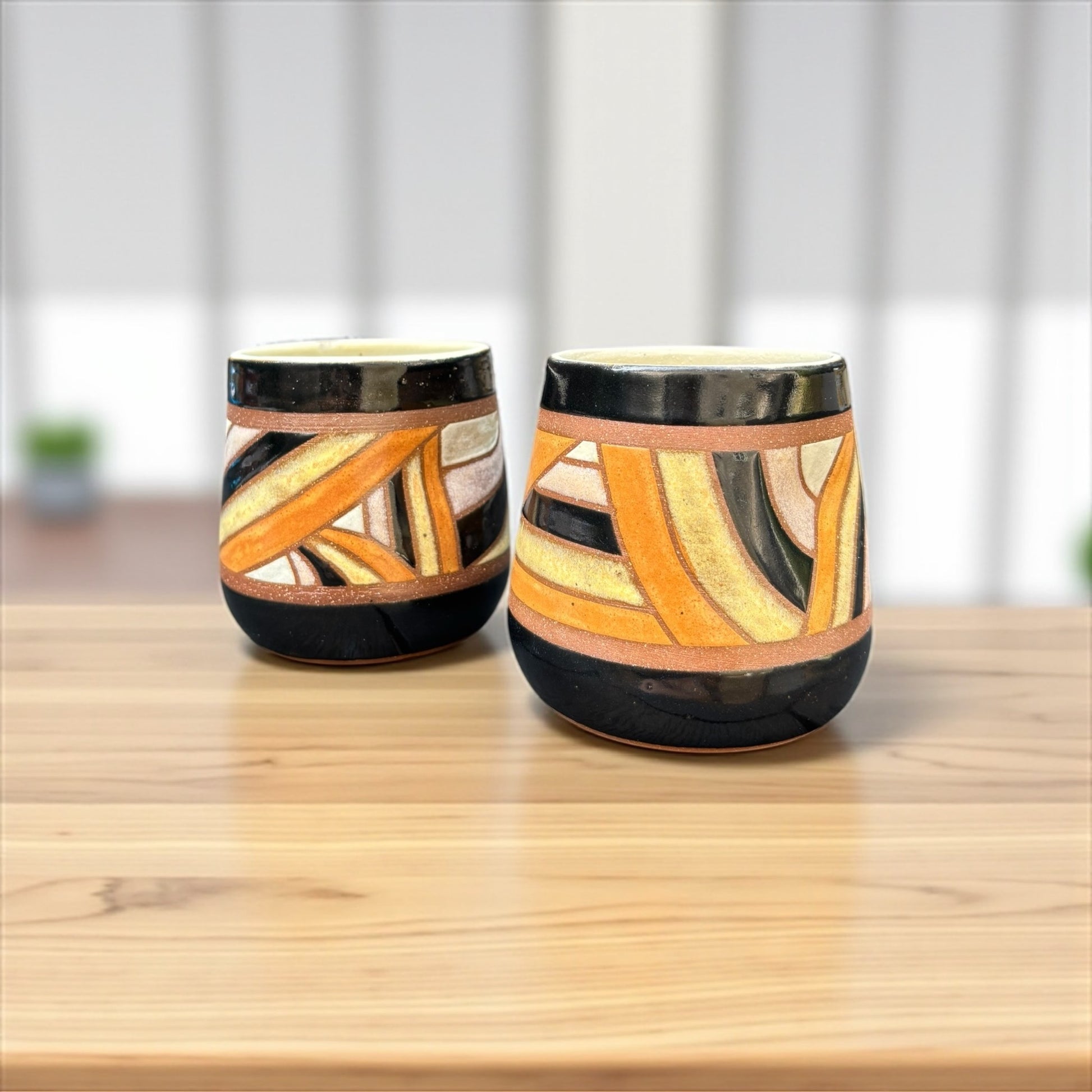 The Strata Mug is a handmade ceramic coffee mug with layered glazes that create natural, stone-like bands of color. Each piece is unique, bringing earthy texture and artisan character to your drinkware collection. Perfect for coffee, tea, or any cozy beverage.